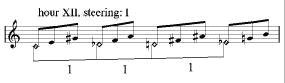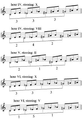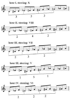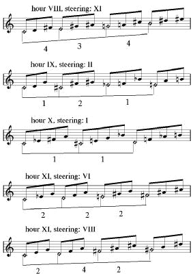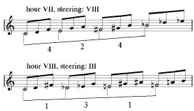 In the example on the left half of this page all the hours are displayed with their steerings. Some of the hours are only steered by one other hour, and others can be steered by more than one. There are of course much more possibilities, but they all result in the same combination of harmonies. For instance in his book, Peter Schat also mentions the steering of the eighth hour by the the fourth hour (4-1-4, for instance G-B-C-E), but this is a variation on the steering by the eleventh hour (4-3-4, in vb. 1: C-E-G-B). Notice that the notes are the same, they are only placed in a different sequence. The principal of steering described in this chapter, concerns the basic